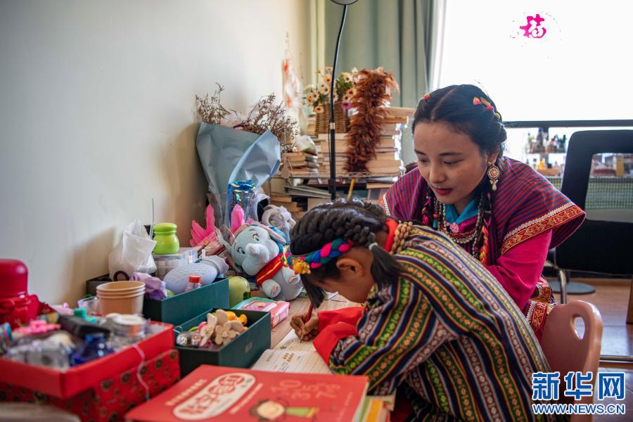 在位于西藏林芝市墨脫縣的家中,扎西玉珍指導女兒寫作業(yè)(2月11日攝)。新華社記者 孫非 攝