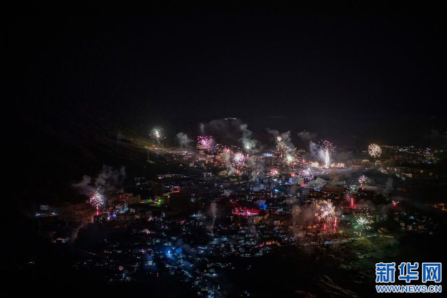除夕夜,墨脫縣城群眾燃放煙花,慶祝牛年到來(2月11日攝)。新華社記者 孫非 攝