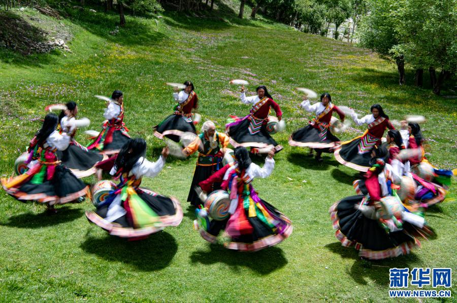 尼瑪(中)和弟子們在表演“久河卓舞”(2020年7月1日攝)。新華社記者 普布扎西 攝