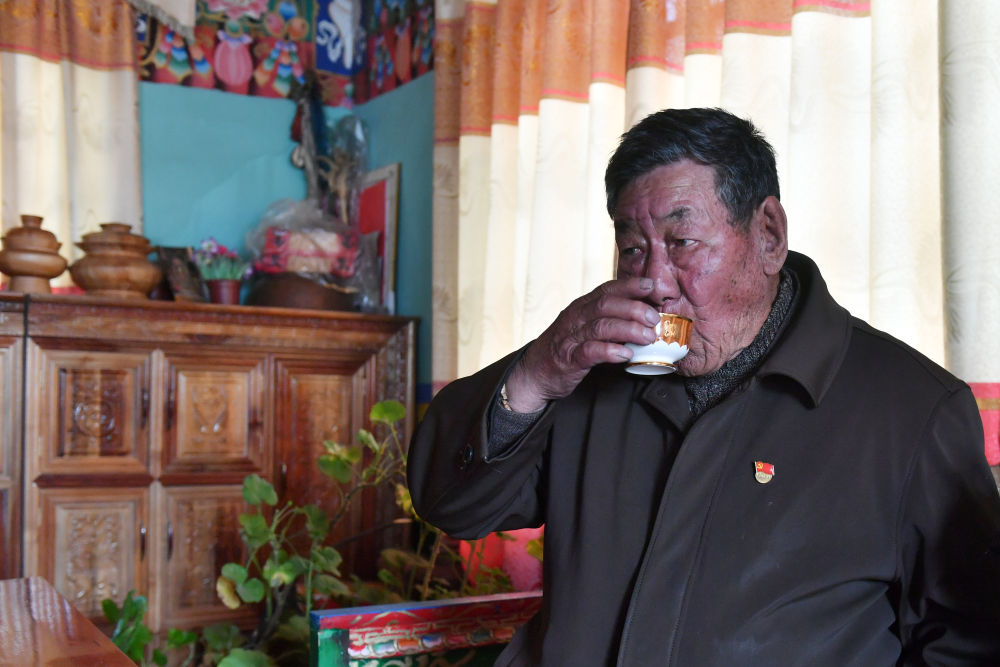 索朗楊佩在位于米林縣單嘎努覺村的家里喝酥油茶(3月30日攝)。