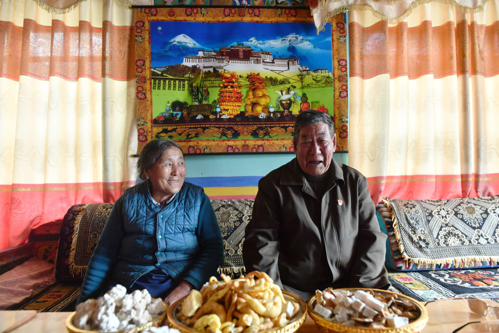 索朗楊佩(右)和老伴兒卓嘎在位于米林縣單嘎努覺村的家中留影(3月30日攝)。