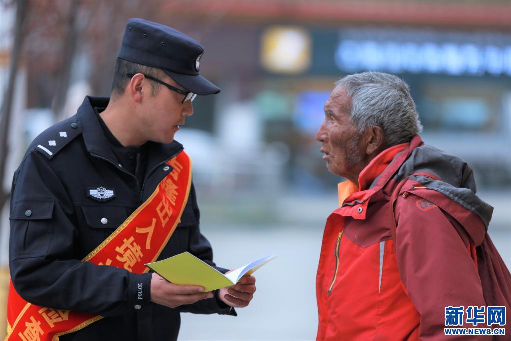 吉隆出入境邊防檢查站警察向駐地邊民普及反恐怖主義法相關(guān)知識。(新華社發(fā) 肖富貴 攝)