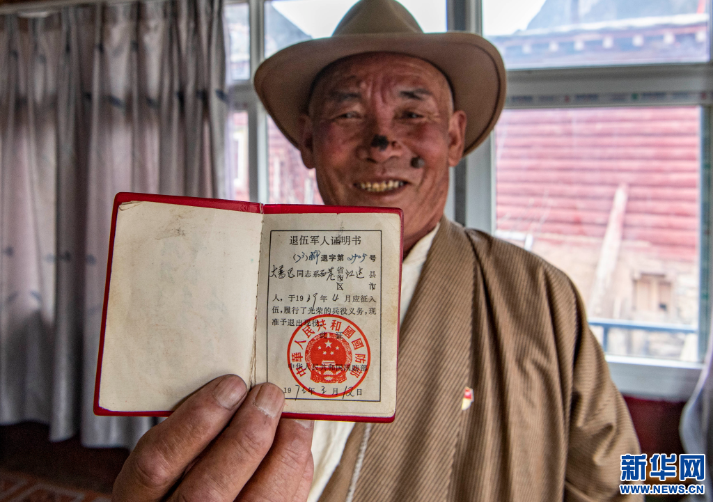 在位于昌都市江達縣崗托鎮(zhèn)崗托村的家中,普巴向記者展示自己的退伍軍人證明書(3月22日攝)。新華社記者孫非 攝