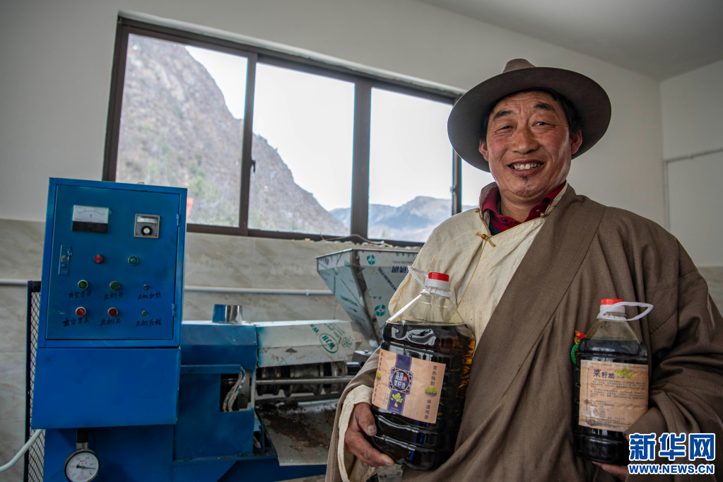 在位于昌都市江達縣崗托鎮(zhèn)崗托村的清油加工廠,永紅正在展示清油產品(3月23日攝)。新華社記者孫非 攝