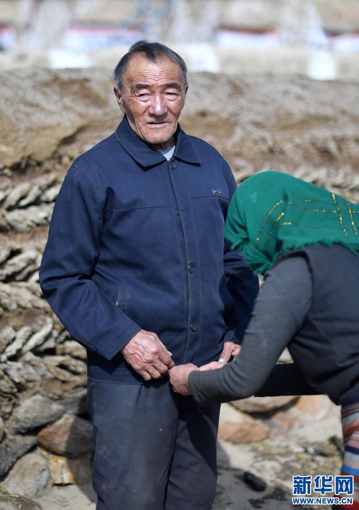 女兒帕珠在幫父親旦達老人整理衣服(4月16日攝)。新華社記者 覺果 攝