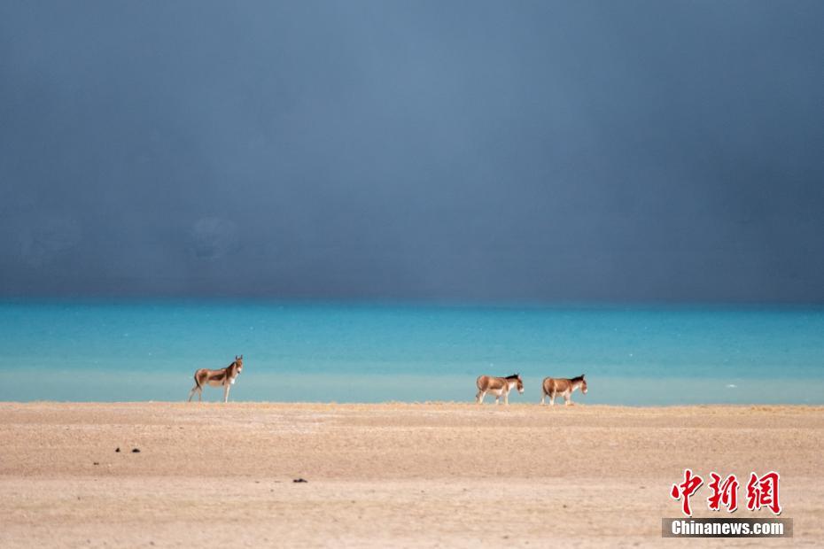 5月2日,三頭藏野驢在西藏第一大湖色林錯(cuò)湖邊覓食。
