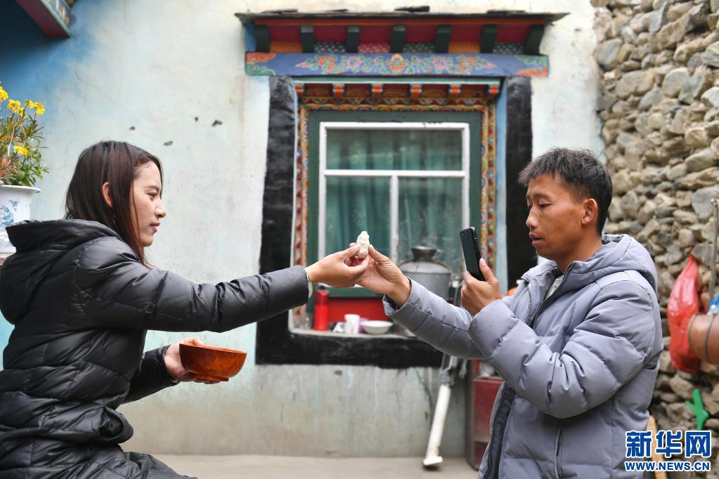 扎西拉姆(左)把剛揉好的糌粑遞給拍攝短視頻的丈夫田輝(4月2日攝)。新華社記者 孫瑞博 攝