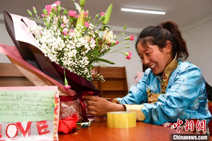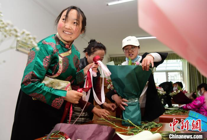 圖為兒童福利院的孩子們跟自己的“媽媽”包裝制作鮮花花束。貢嘎來(lái)松 攝
