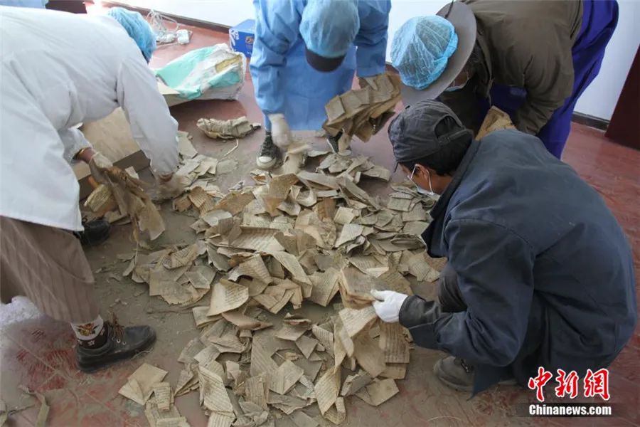 挖掘工作持續(xù)了3天才結(jié)束。由于當時寺院條件簡陋,古籍散葉被臨時裝入編織袋中,足足裝滿了68袋。