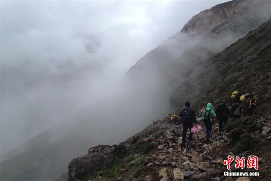 2013年,工作人員在日喀則茹村進行古籍普查。山洪暴發(fā)沖毀道路,大家走在山間的亂石上。受訪者供圖