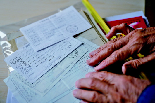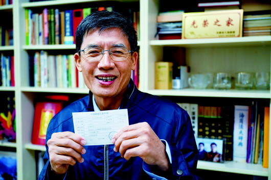 4月22日,李純民在天津家中展示2002年向青藏鐵路建設(shè)捐款的匯款單存根。記者劉金海、黃臻攝