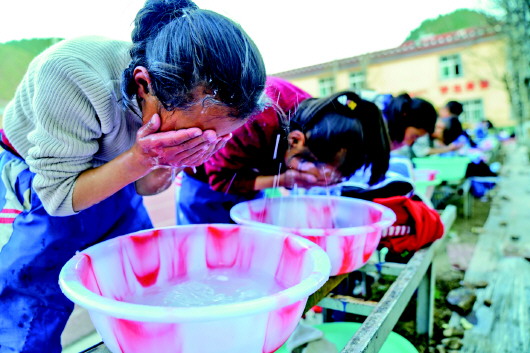 4月30日,在類烏齊縣桑多鎮(zhèn)第二小學(xué),學(xué)生們用熱水洗漱。這套熱水設(shè)施由李純民發(fā)起的“齊興”助學(xué)獎(jiǎng)勵(lì)基金捐助。 記者劉金海、黃臻攝