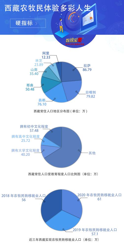 數(shù)據(jù)顯示,西藏和平解放70年來,常住人口從100多萬人增加到364.81萬人。2019年底,西藏74個貧困縣全部摘帽,62.8萬建檔立卡貧困人口全部脫貧。2020年,西藏地區(qū)生產總值突破1900億元,同比增長7.8%。