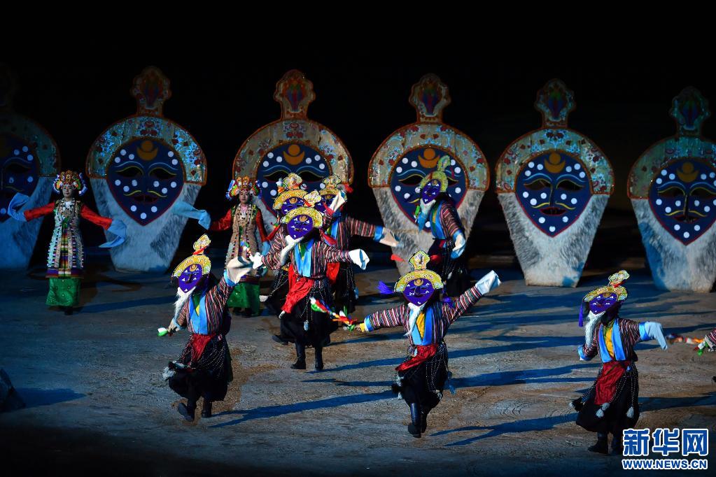 大型實景劇《文成公主》演職人員共計800余名,除專職演員外,很多當?shù)夭刈遛r牧民參與演出,有效促進了當?shù)厝罕娋蜆I(yè)增收。圖為演員在劇中表演藏戲(2019年10月31日攝)。新華社記者 李鑫 攝