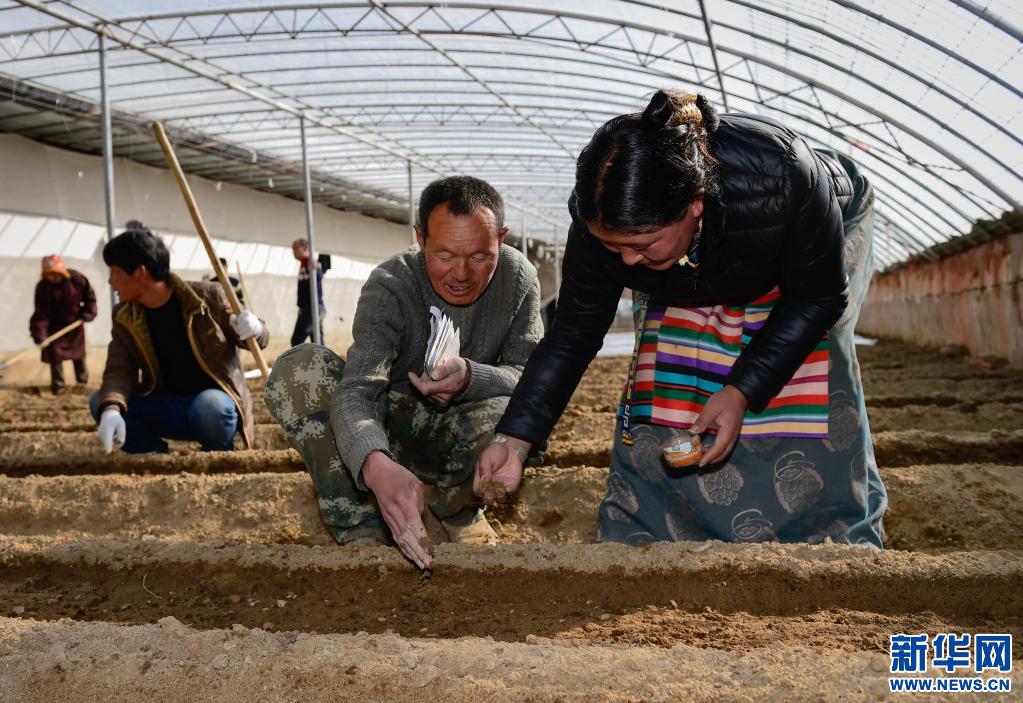 2018年3月13日,西藏阿里地區(qū)噶爾縣生態(tài)農業(yè)產業(yè)園農技人員楊茂錄(右二)在園區(qū)大棚中為當?shù)刎毨羰_桑嘎(右)傳授瓜果種植技術。新華社記者 劉東君 攝