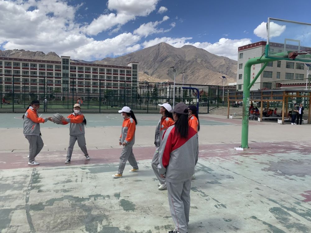 6月1日,西藏自治區(qū)拉薩市,拉薩那曲第二高級中學女學生次拉(右二)在跟男同學打籃球。新華社記者齊菲攝