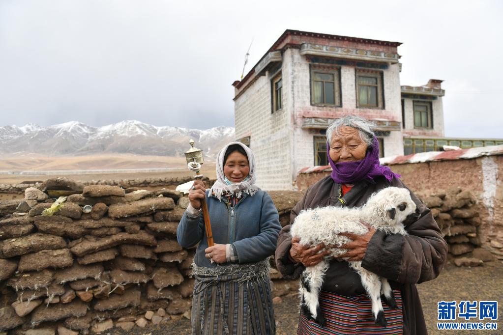 斯曲老人在牧區(qū)抱著小羊羔(4月15日攝)。新華社記者 孫瑞博 攝