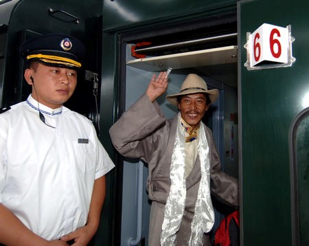 2006年7月1日,第一位檢票登車的乘客——來自拉薩柳梧鄉(xiāng)的達瓦桑布——登上慶典列車后向站臺上的人們揮手。