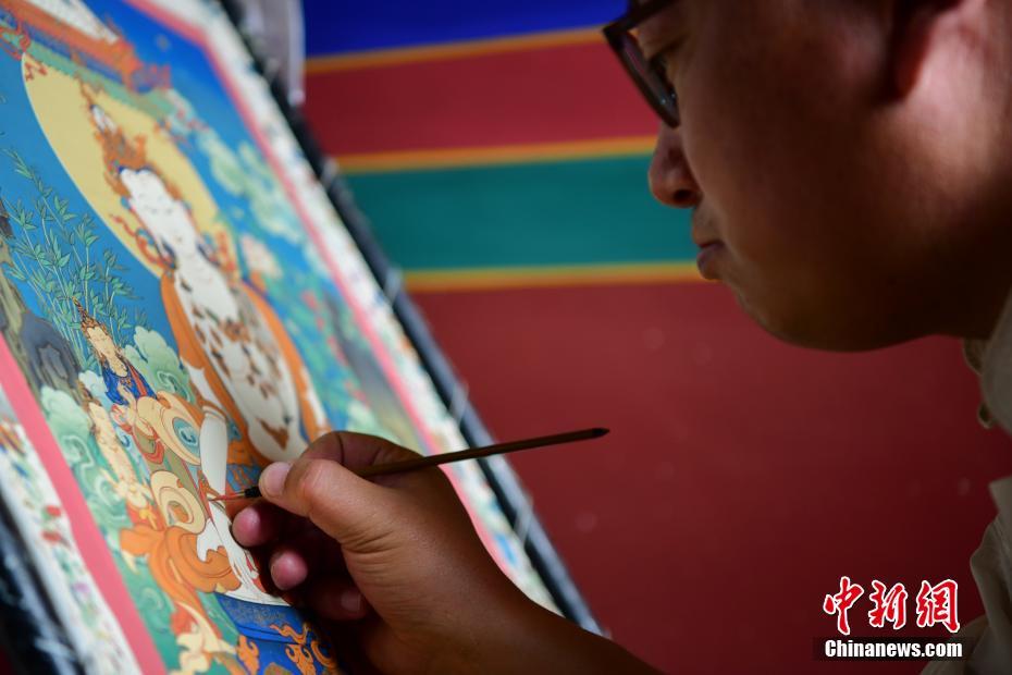 6月12日,2021年“文化和自然遺產(chǎn)日”西藏非遺展演展示系列活動(dòng)在拉薩舉行?;顒?dòng)現(xiàn)場(chǎng)融入了文藝演出、非遺展演、非遺產(chǎn)品展銷等內(nèi)容,市民游客可親身體驗(yàn)非遺產(chǎn)品的制作過程。圖為非遺傳承人在手繪唐卡。 中新社記者 貢嘎來松 攝