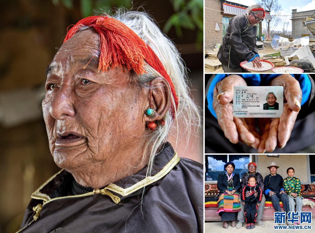 右下:這是索朗老人和兒子扎西(右二)、孫媳婦次仁央宗(左一)及曾孫女在一起合影(4月18日攝)。