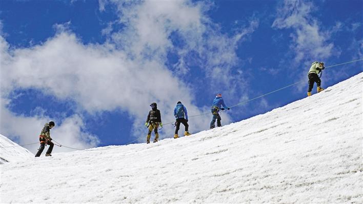 壓題圖片為洛堆峰登山探險活動中,登山愛好者在5400米雪線處進(jìn)行冰雪和登山技術(shù)訓(xùn)練。記者 鄭璐 張姝 攝