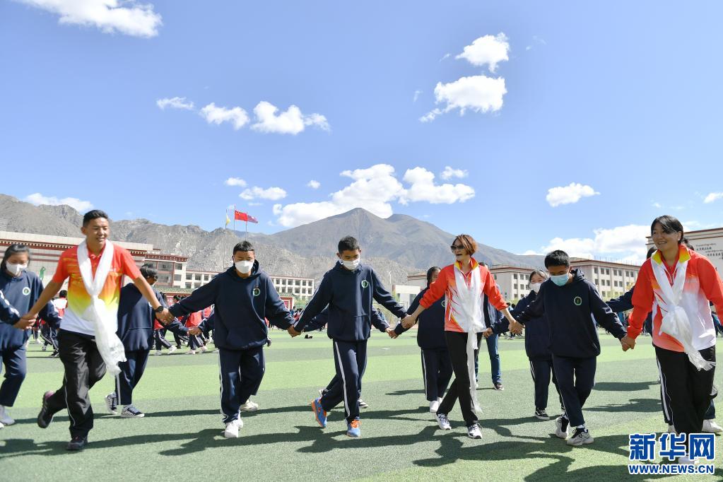 6月25日,跳水奧運冠軍高敏(前右三),西藏和平解放以來首個競技體育世界冠軍、摔跤運動員西洛卓瑪(前右一)和成功登頂七大洲最高峰并徒步到達南北極點的西藏登山運動員德慶歐珠(前左一)在拉薩市阿里高級中學和學生們一起跳鍋莊課間操。新華社記者 孫瑞博 攝