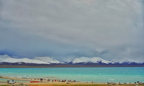 從羊八井出發(fā)至當(dāng)雄縣,有一條向左的岔路,沿著這條路一直向前開約60公里,就能到達(dá)西藏最著名的景區(qū)之一——納木措。納木措,湖面海拔4718米,形狀近似長方形,東西長70多千米,南北寬30多千米,湖的東南部是直插云宵、終年積雪的念青唐古拉山主峰,清澈的湖水便來自念青唐古拉山融化的冰雪,北側(cè)則倚偎著和緩連綿的高原丘陵,廣闊的草原繞湖四周,似是將納木措小心翼翼地護(hù)在懷中。湖水顏色由罕見的碧藍(lán)與碧綠色相結(jié)合,是畫師都不易調(diào)出的顏色,遠(yuǎn)遠(yuǎn)望去,碧波粼粼的湖水與周圍的山脈、草原、藍(lán)天、白云交相輝映,令在場(chǎng)的人不禁連連感嘆仿佛置身于仙境之中。