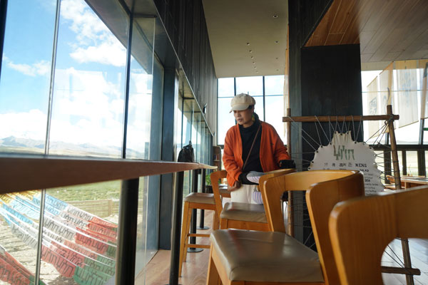 從正門進(jìn)入,穿過牦牛文化空間走廊,便可到能夠以最佳視角欣賞念青唐古拉山的VR觀景臺(tái)。緊鄰觀景臺(tái)右側(cè),是一間擺放當(dāng)?shù)匚膭?chuàng)產(chǎn)品、各類書籍的觀景咖啡廳。該咖啡廳的兩面墻體設(shè)計(jì)為超大落地窗,在此休息的游客可以邊品嘗咖啡,邊欣賞念青唐古拉山及拉多草原的美景。走進(jìn)咖啡廳,記者看到不少在這里休息的游客都在低頭寫著什么,經(jīng)咖啡廳負(fù)責(zé)人介紹:“這些游客是在寫明信片,我們這里不僅提供餐飲,還提供印有本地風(fēng)景的明信片,并同中國郵政合作,幫助游客按時(shí)將明信片寄到他們的親朋好友手中,讓游客們的旅途變得更有意義?!?/p>