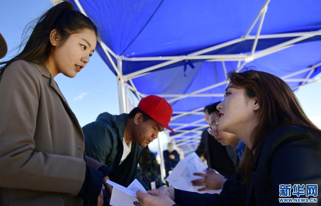 西藏的大學(xué)畢業(yè)生(左)在和就業(yè)援藏的用人單位工作人員溝通(2019年6月20日攝)。 新華社記者 張汝鋒 攝
