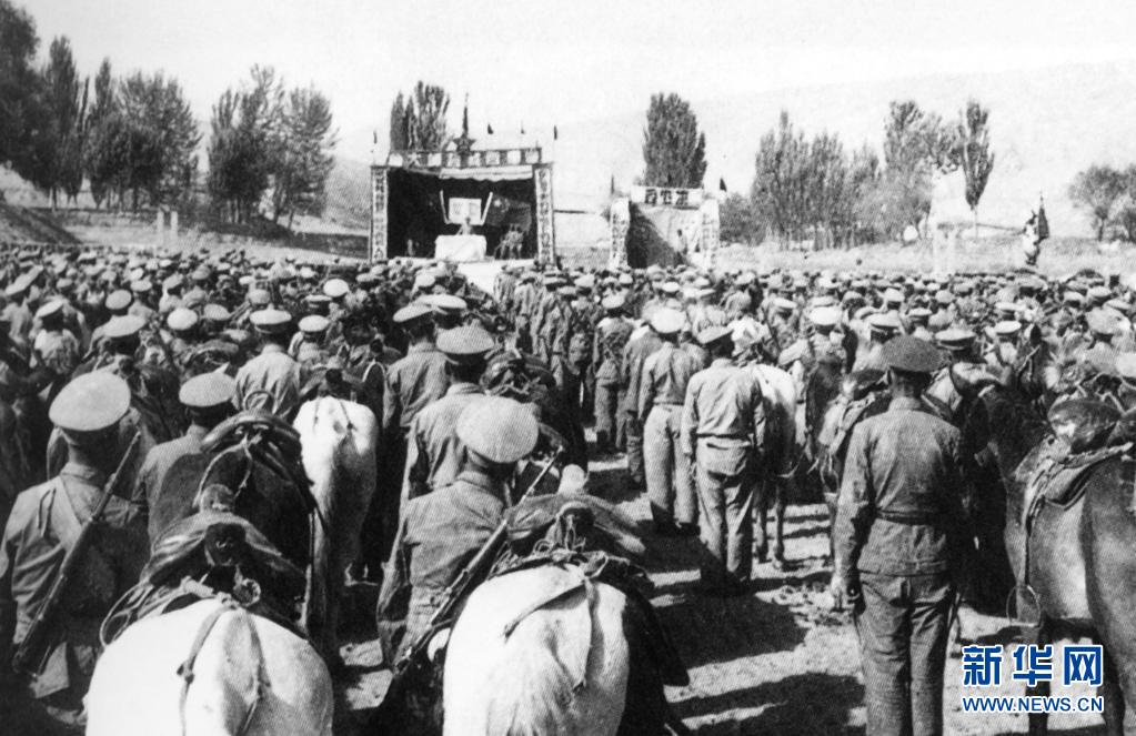 獨(dú)立騎兵師一團(tuán)在新疆于田縣普魯村召開(kāi)進(jìn)藏誓師大會(huì)(資料照片)。新華社發(fā)(進(jìn)藏英雄先遣連紀(jì)念館供圖)