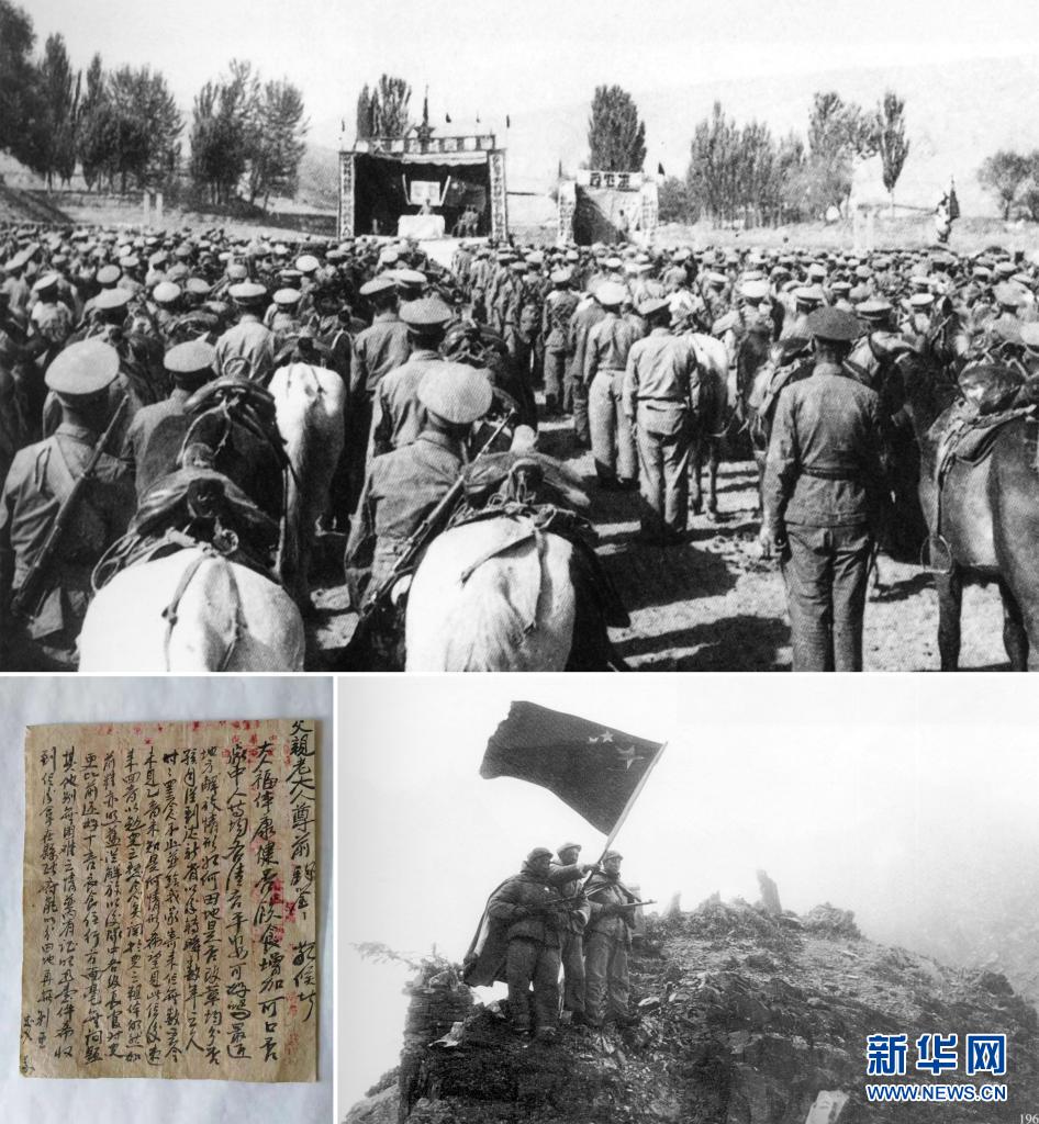 這是一張拼版照片,上圖為:1950年8月1日,獨(dú)立騎兵師一團(tuán)在新疆于田縣普魯村召開(kāi)進(jìn)藏誓師大會(huì)(資料照片,進(jìn)藏英雄先遣連紀(jì)念館供圖);左下圖為:先遣連烈士陳忠義的家書(shū)(受訪者供圖);右下圖為:1951年,阿里和平解放(資料照片,進(jìn)藏英雄先遣連紀(jì)念館供圖)。新華社發(fā)