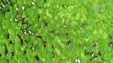 牦牛踏過碧綠的牧場