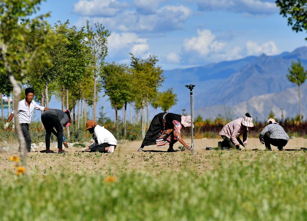 當(dāng)?shù)厝罕娫谏侥鲜性铱h藏草萬畝植物種苗繁育基地勞動(dòng)(2019年8月29日攝)。新華社記者張汝鋒 攝