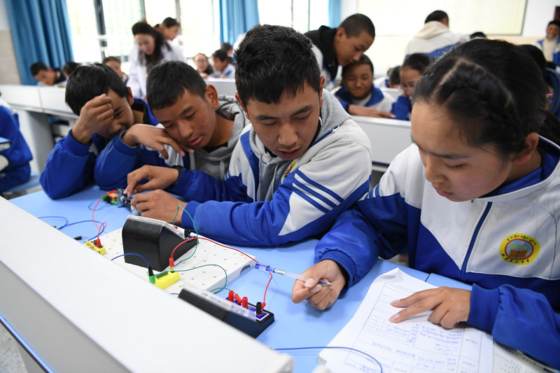 圖為拉薩市第六中學(xué)的學(xué)生們正在物理實(shí)驗(yàn)室做電阻實(shí)驗(yàn)。記者 唐斌 次旺 攝