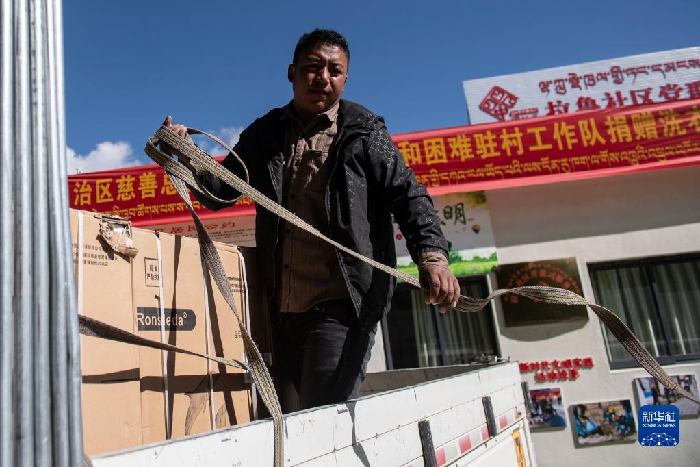 9月7日,拉薩市墨竹工卡縣貼朗村駐村工作隊(duì)隊(duì)員楊愛軍(右)和當(dāng)雄縣加多村駐村工作隊(duì)隊(duì)員拉平查收全自動洗衣機(jī)。新華社記者 孫瑞博 攝
