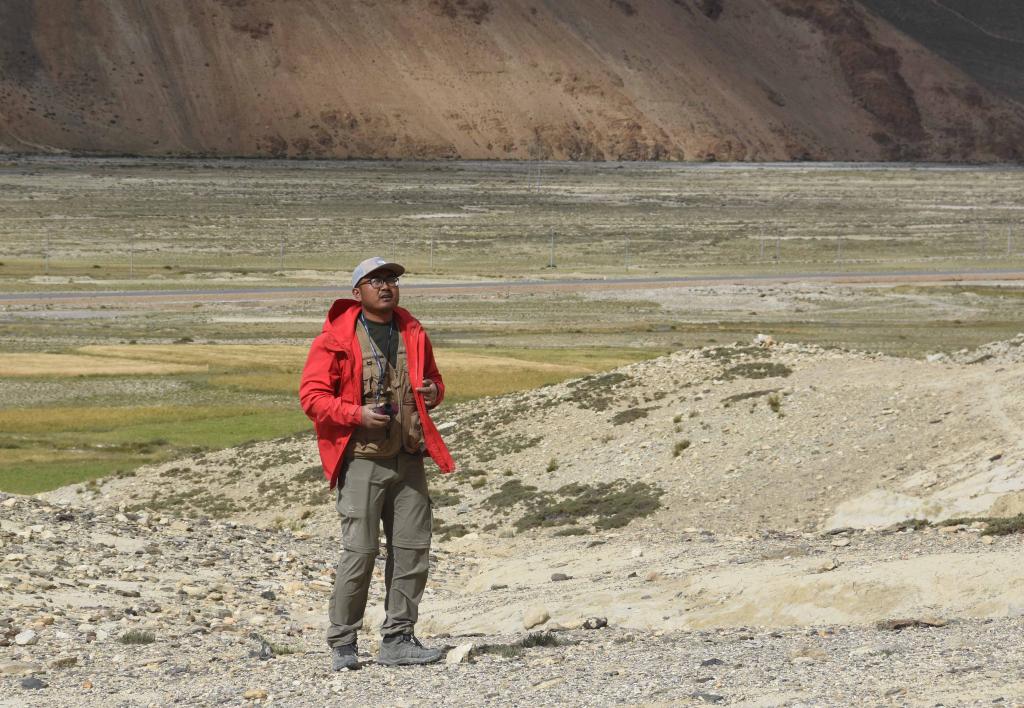 8月27日,科考隊員王昊手里握著測距儀,對山體進行觀察。新華社記者杜剛 攝