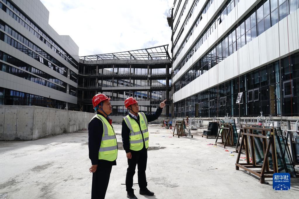 中鐵建工集團(tuán)西藏自治區(qū)醫(yī)院項(xiàng)目經(jīng)理張磊(右)與項(xiàng)目黨支部書記王曉飛(左)查看施工情況。(2021年9月18日攝)。新華社記者 劉洪明 攝