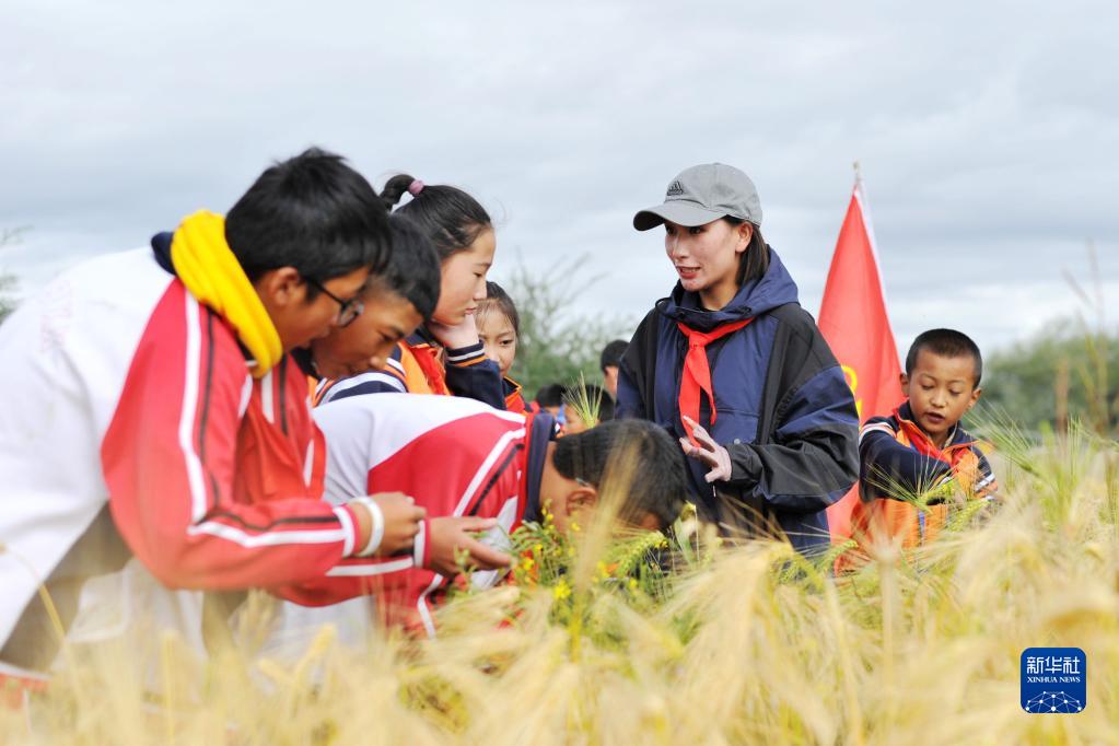 日喀則市上海實驗學(xué)校的學(xué)生們在青稞地里聽講解(9月17日攝)。新華社 潘杰 攝