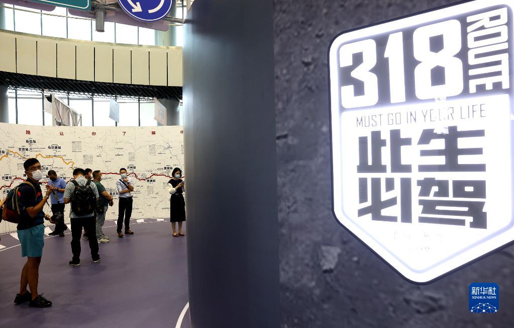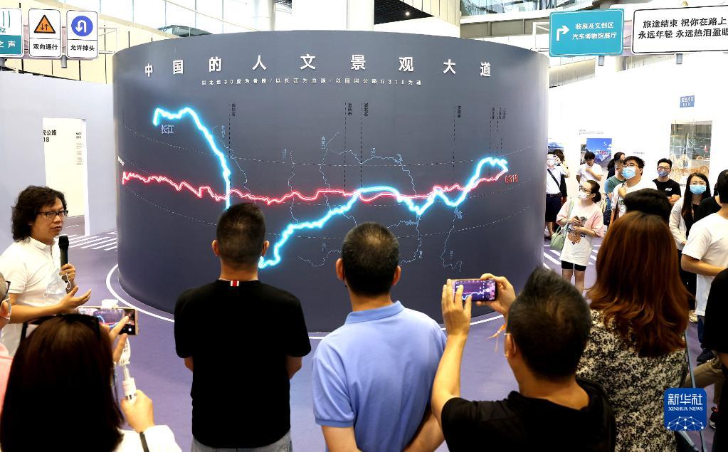 9月28日,觀眾在“公路文化在中國”主題展上觀看318國道示意圖。新華社記者 陳飛 攝