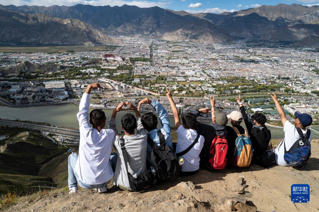 一群大學(xué)生在拉薩市南山生態(tài)園的祖國萬歲山山頂合影(9月20日攝)。新華社記者 孫瑞博 攝