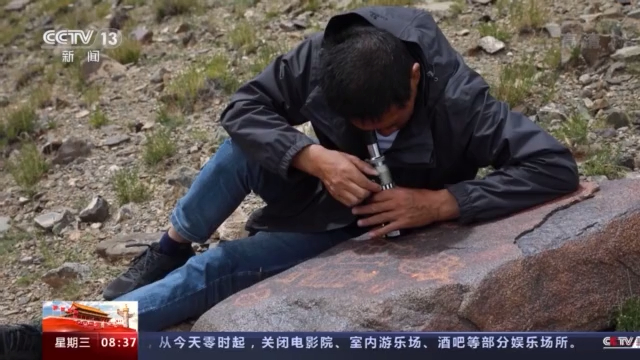總臺(tái)記者 陳琴:現(xiàn)在我們是跟隨科考隊(duì)員來到了海拔4700米的加林山巖畫這么一個(gè)分布區(qū)域,這里的位置就是在尼瑪縣榮瑪鄉(xiāng)依布茶卡鹽湖的旁邊,我們看見科考隊(duì)員正在對(duì)這幅巖畫進(jìn)行登記和記錄。