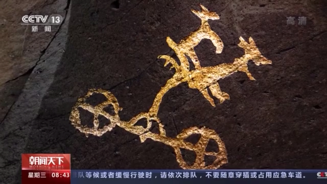 中國巖畫學(xué)會(huì)副會(huì)長、西北大學(xué)文化遺產(chǎn)學(xué)院特聘教授 張建林:這種兩個(gè)三角形相對(duì)的這種動(dòng)物軀體,是在中亞地區(qū)比較典型的。是一個(gè)非常有意思的一個(gè)研究課題。