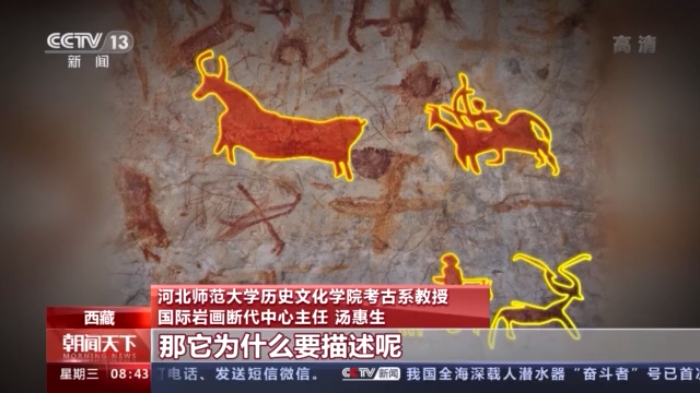 由青藏高原考古研究專家團(tuán)隊(duì)與總臺(tái)記者組成的“納木錯(cuò)環(huán)湖科考隊(duì)”走進(jìn)藏北高原和無人區(qū),在平均海拔5000米的羌塘國家級(jí)自然保護(hù)區(qū),對(duì)古代巖畫、古遺址、古墓葬及地質(zhì)地理環(huán)境,展開綜合考察,并首次對(duì)藏北的鑿刻巖畫進(jìn)行科學(xué)測(cè)年??瓶缄?duì)員對(duì)尼瑪縣128幅巖畫的調(diào)查發(fā)現(xiàn),藏北高海拔地區(qū)不少動(dòng)物形象都在巖畫中有所反映,體現(xiàn)了羌塘高原獨(dú)特的自然與人文之美。