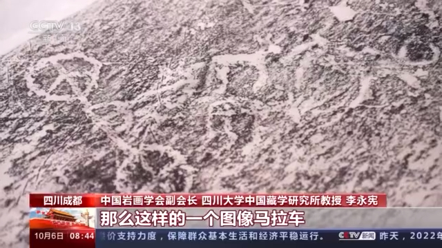 中國巖畫學(xué)會(huì)副會(huì)長、四川大學(xué)中國藏學(xué)研究所教授 李永憲:那么這樣的一個(gè)圖像馬拉車,騎馬的人、牦牛、三只鹿、公鹿,所有的動(dòng)物、人物、車輛,它們都是朝一個(gè)方向行進(jìn)。