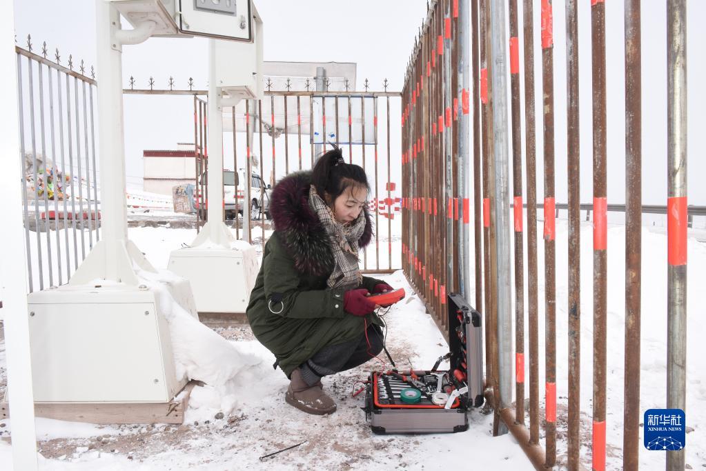 洛松拉姆在世界海拔最高有人值守氣象站——安多氣象局唐古拉山交通自動氣象站準備檢修設備(2019年1月28日攝)。新華社記者 周健偉 攝