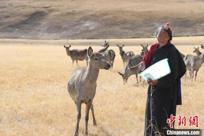 圖為和馬鹿打了一輩子交道的藏族阿媽向秋拉姆正在喂食馬鹿。冉文娟 攝