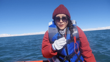 第一天早上,一路顛簸了近4個小時,我們一行抵達雀莫錯。雀莫錯是位于長江源頭區(qū)域的一個較大的湖泊。當天,中科院青藏所的專家們需要在湖中心取水樣。站在湖邊,風特別大,陽光刺到睜不開眼。通過反復溝通,我們爭取到了和專家一起上船采樣的機會。為什么要上湖?在湖邊出個鏡不香嗎?因為我始終相信,要拍到生動的一手資料,那就得離得足夠近。