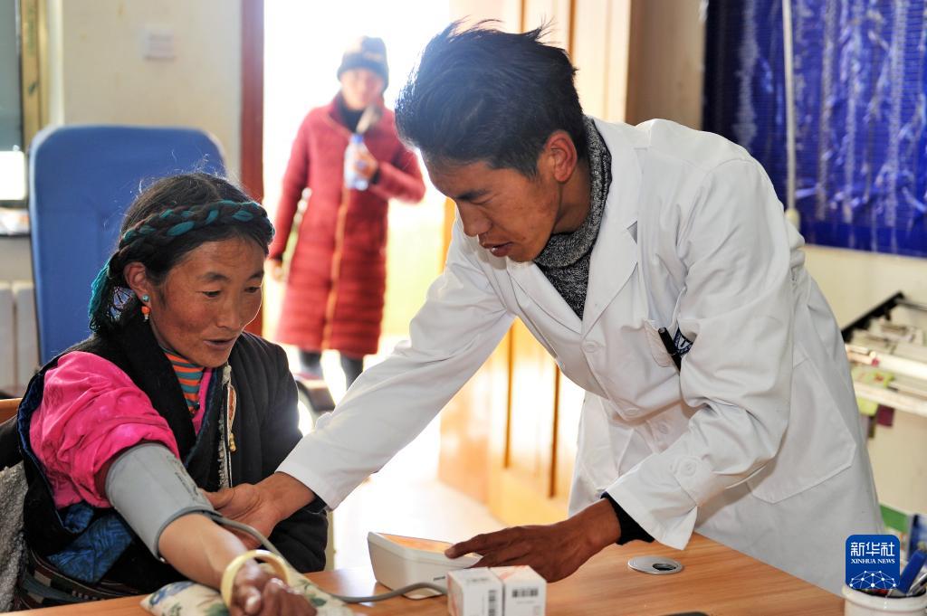 圖為全科醫(yī)生旺扎在為一名農(nóng)牧民測量血壓(2018年1月14日攝)。新華社記者張汝鋒 攝