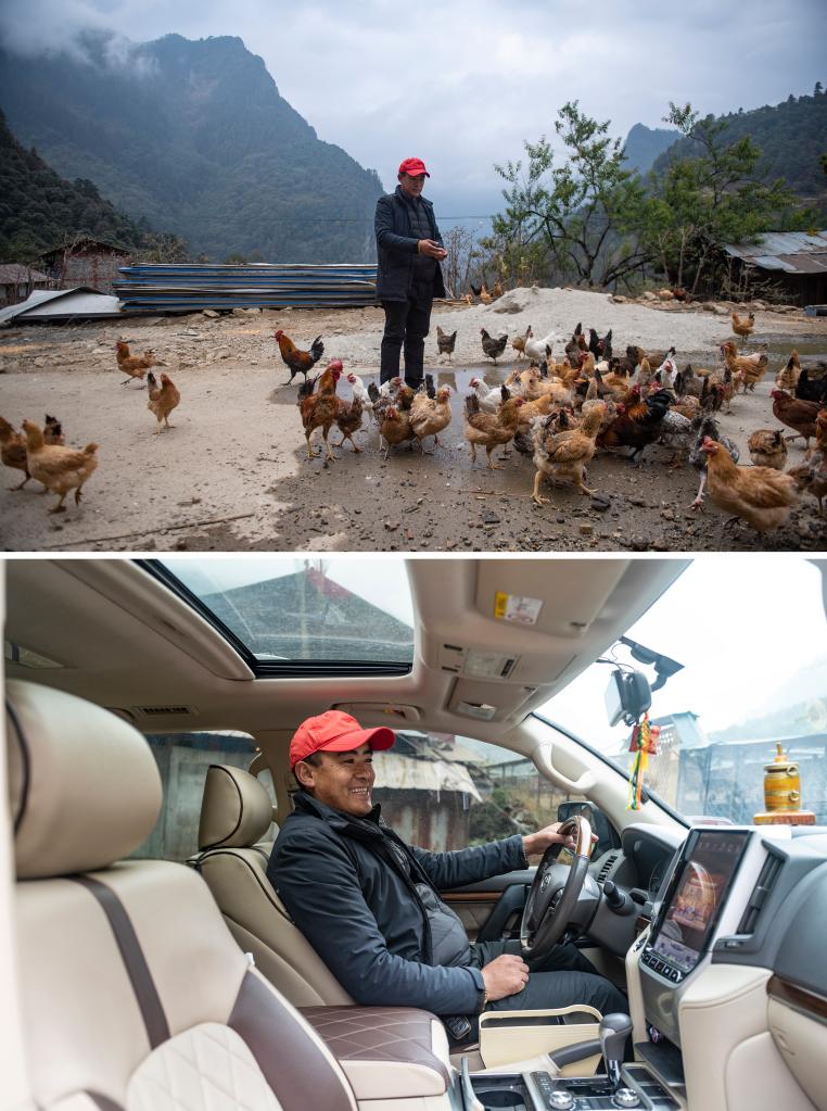 拼版照片:上圖為,陳塘鎮(zhèn)的致富帶頭人拉巴塔杰給養(yǎng)雞場的散養(yǎng)雞喂食;下圖為,拉巴塔杰坐在自己致富后購買的越野車內(nèi)(均為11月25日攝)。 新華社記者 孫瑞博 攝