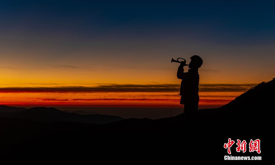 2022年1月1日,西藏軍區(qū)某旅駐守在海拔4600米的邊防執(zhí)勤點的任務(wù)分隊官兵,在邊關(guān)戰(zhàn)位上迎來了新年的第一縷陽光。新年第一天,分隊官兵踏上天險巡邏路,趟冰河,翻峭壁,鉆叢林,巡邏行程超過30公里,海拔落差近千米。圖為黎明時分,新年的第一次號聲。 西藏軍區(qū)某旅 供圖